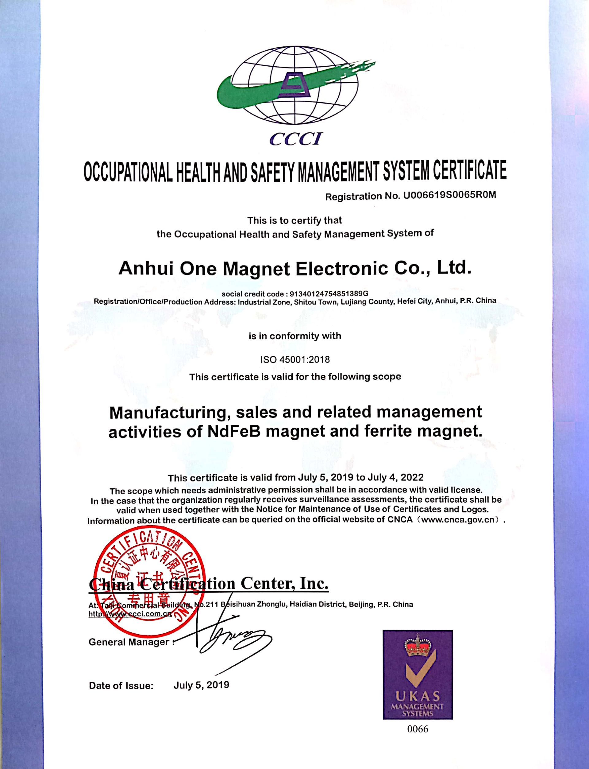 ISO45001:2018 Certificate-Occupational health and safety management systems